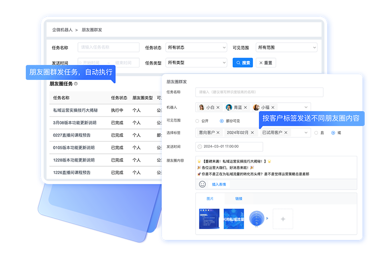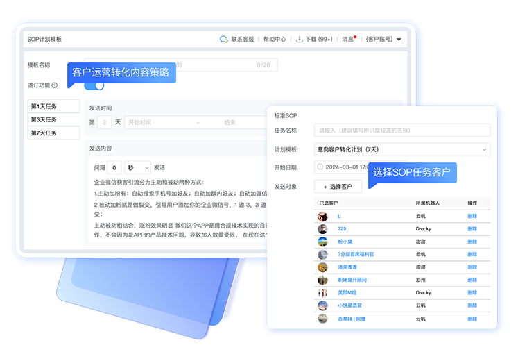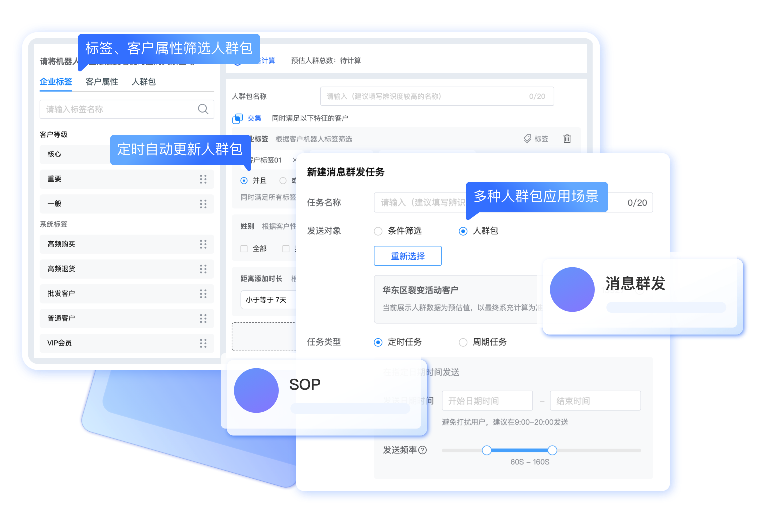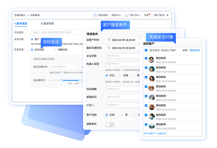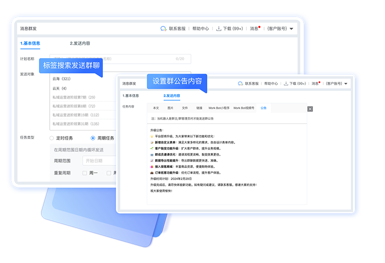 精准识别客户,消息群发、超级群发,不限群发次数,一键触达客户,无需人工操作