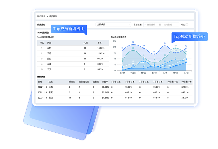成员获客数量、留存数量排名,周期发展趋势