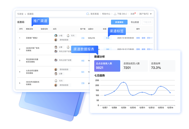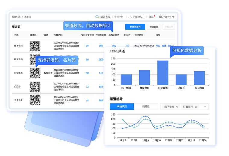 渠道分流、数据统计,支持名片码、群活码,分渠道入群活动建议使用渠道码