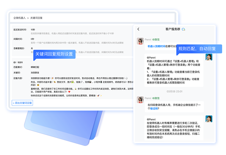 设置关键字回复规则,群成员发送消息命中关键字规则自动发送回复内容