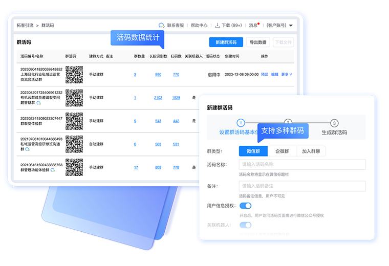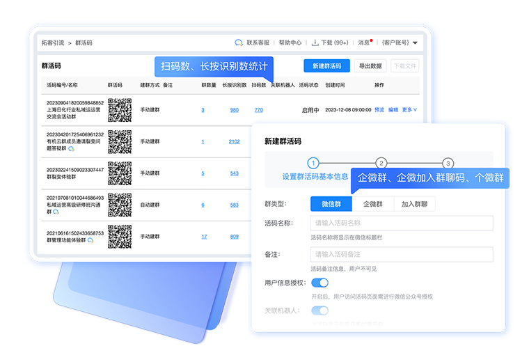 用户扫码自动分流,支持微信群、企微群码展示,自动统计扫码用户、进群用户