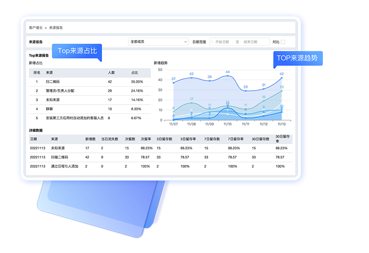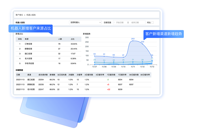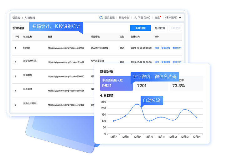 自动打客户标签、渠道标识,自定义渠道欢迎语,联系码分组管理 客户线索转化自动回传广告平台,优化SEM平台广告投放