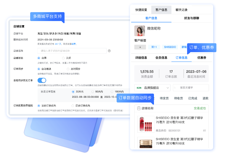 支持驿氪、微盟、有赞、淘宝、京东、抖店、商家自建商城接入