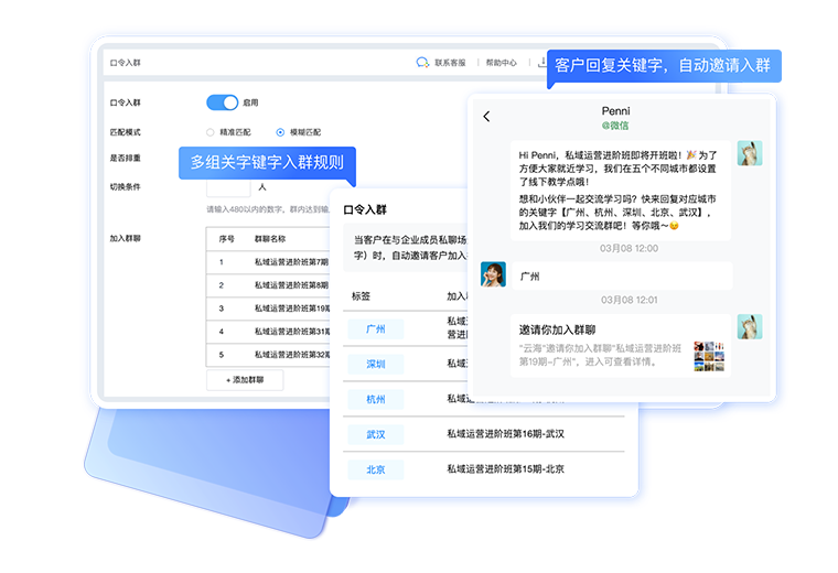 客户在私聊会话中发送关键字,自动将客户邀请加入指定群聊