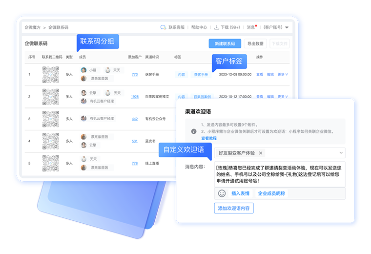 自动打客户标签、渠道标识,自定义渠道欢迎语,联系码分组管理