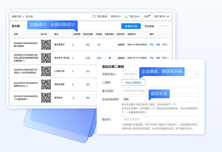 支持展示企业微信名片码、联系码,个人微信二维码 扫码人数统计、长按识别人数统计