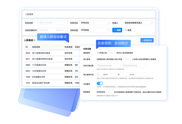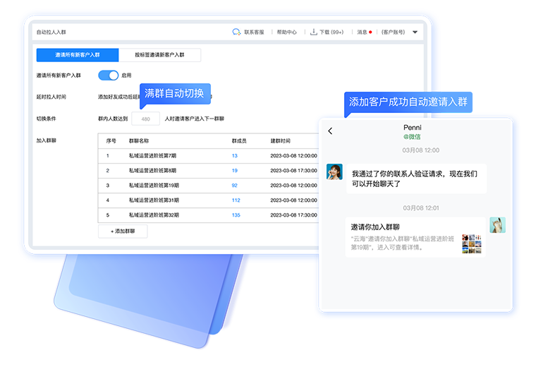 支持设置邀请客户范围及加入群聊规则;支持对入群邀请发送成功但未加入群聊客户进行重发邀请