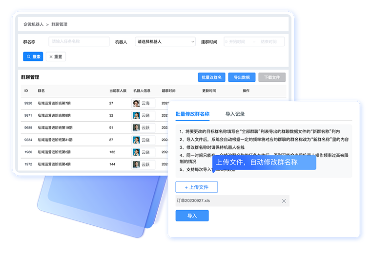 下载群聊数据模板,修改群名后上传文档批量修改群名称等群数据