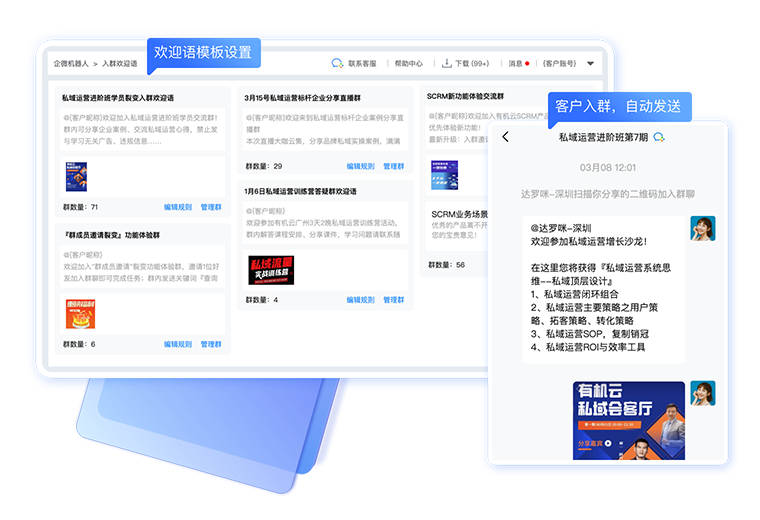 客户加入群聊自动发送入群欢迎语,支持发送文字、图片、视频、链接、小程序、视频号等内容