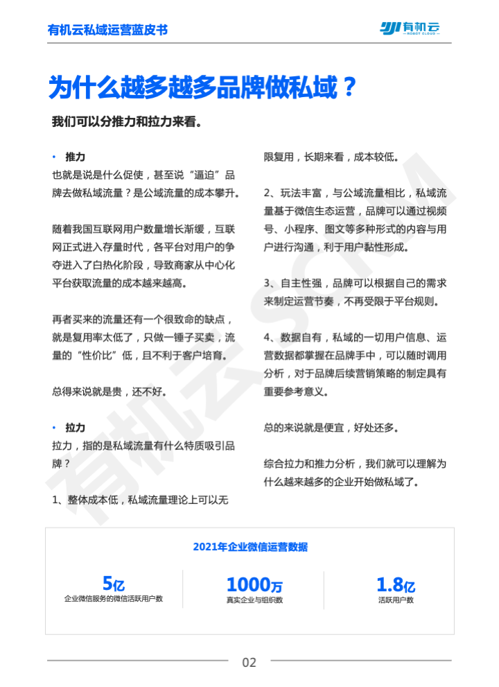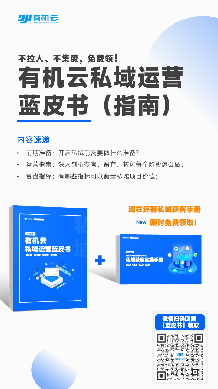 《2023有机云私域运营蓝皮书》是由有机云内容团队编写的私域运营指南,本指南由浅入深,从基础的企微注册、养号,再到进阶的获客、运营、转化,对私域运营的全阶段都给出了较系统的落地指南建议,是企业运营私域不可多得的启蒙资料,内容速递: